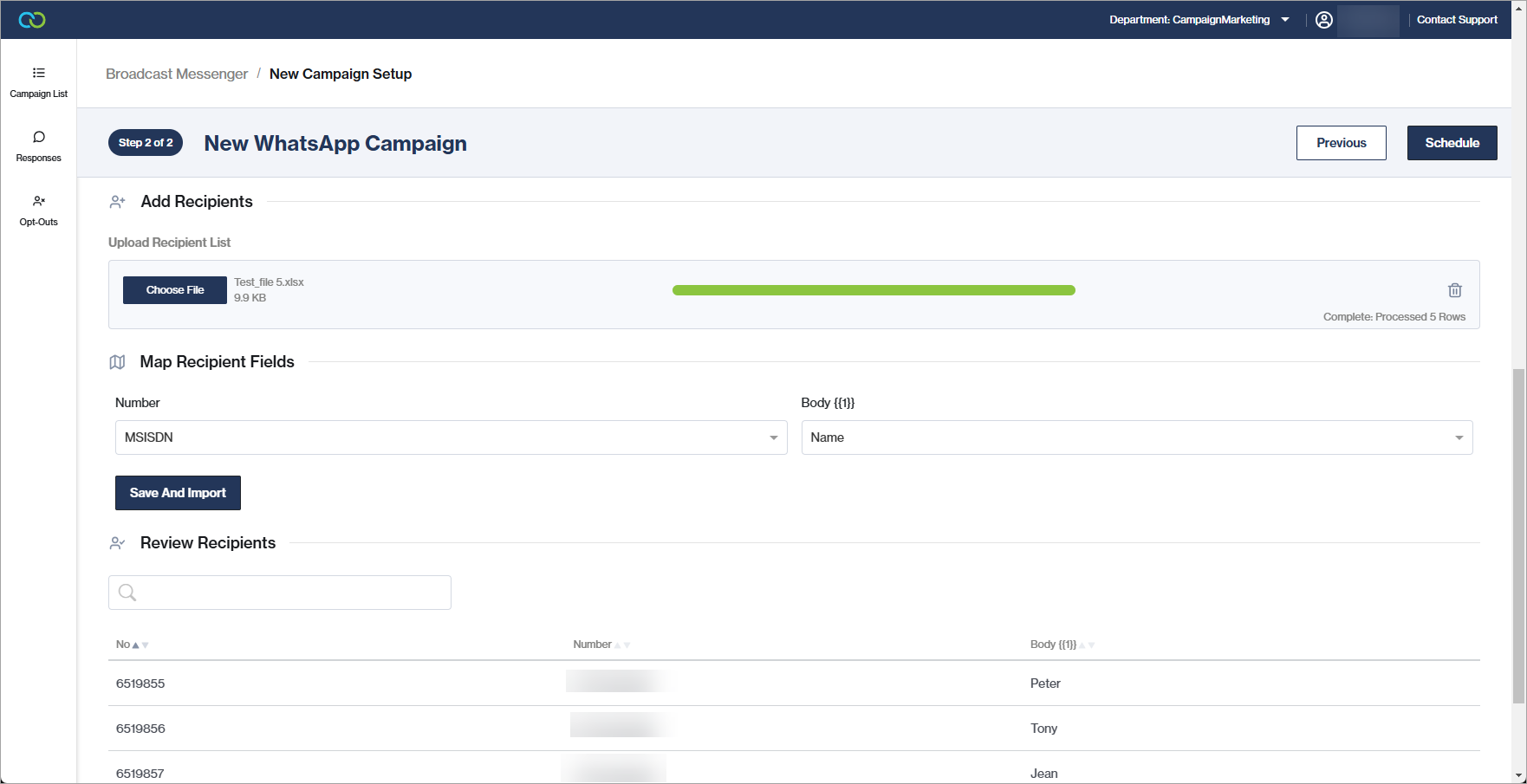 Click Save and Import. The table displays an extract of the file you imported for review. You can search for a specific recipient using the MSISDN (mobile) number.