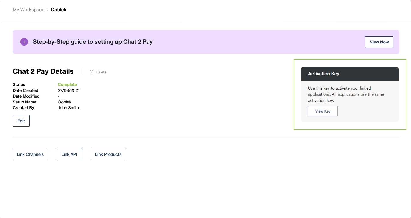 Once successfully configured, an Activation Key is generated. This is the key you'll use to authenticate Chat 2 Pay API calls and activate your linked applications like Salesforce.