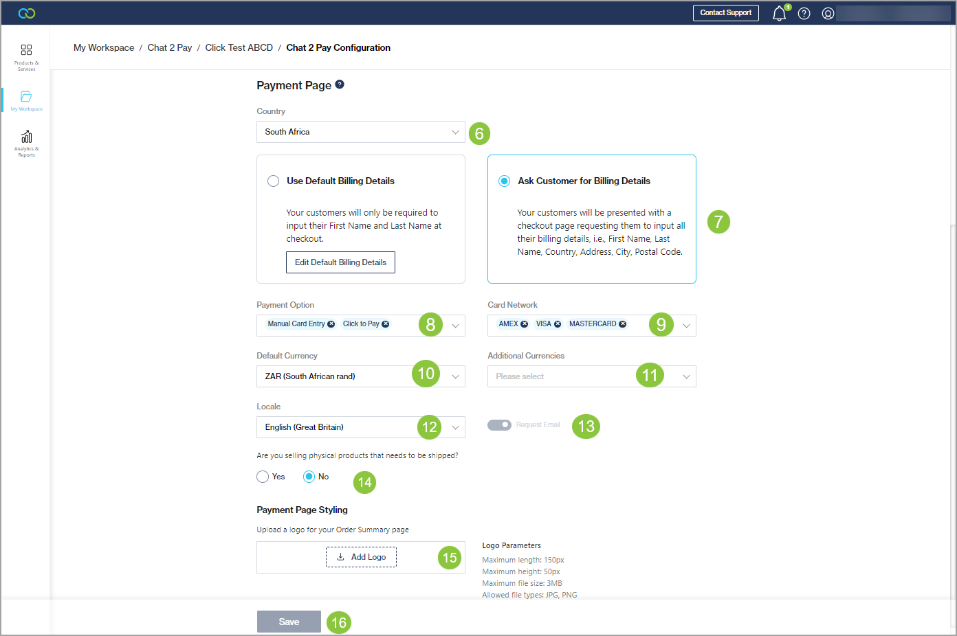Billing Details: Select to use the default billing details or ask the customer to enter their billing details.
