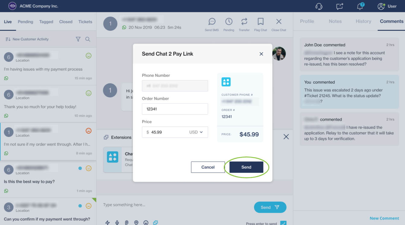 Salesforce Order Management Integration: Embed a Chat 2 Pay โextensionโ into your Salesforce CRM/OMS to allow a call center agent to trigger the payment request.