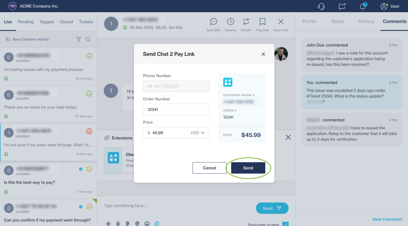 Salesforce Order Management Integration: Embed a Chat 2 Pay “extension” into your Salesforce CRM/OMS to allow a call center agent to trigger the payment request.