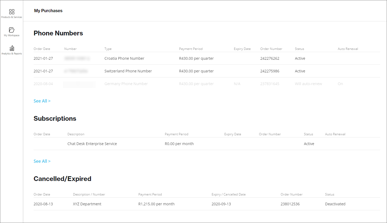 All your purchases (e.g., short codes, long numbers, subscriptions, and renewals) and their details are listed. Any subscriptions that have expired or were canceled are also listed.