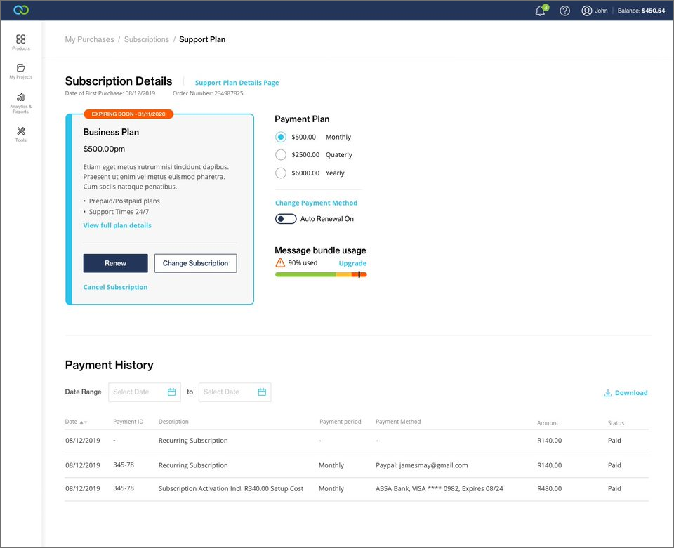Clicking on any subscription from the Subscriptions table displays the details of this subscription. You can update your subscription, pay subscriptions due, and view payment history. You can also view how much of your monthly message bundle you've already used.