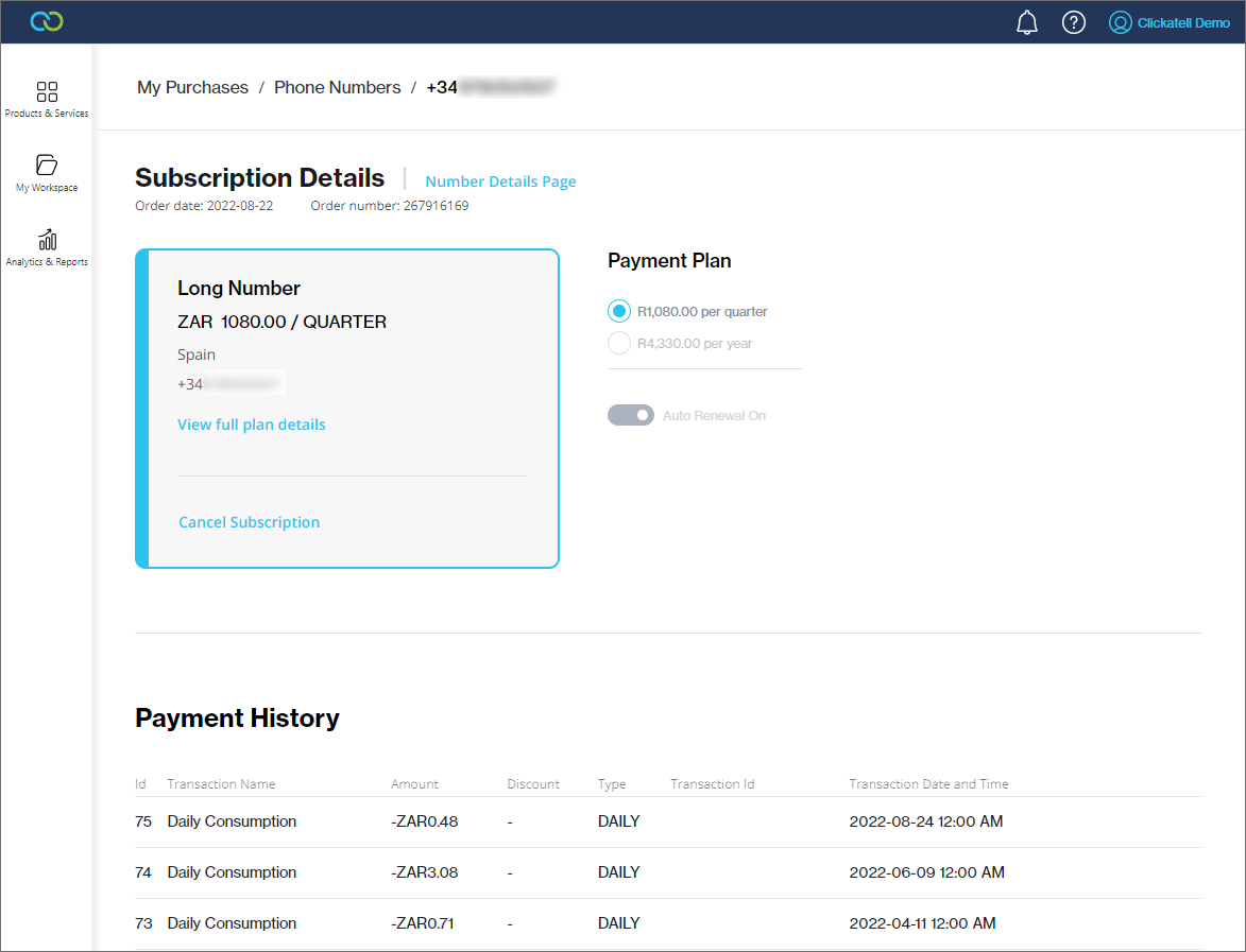 Clicking on any number from the Phone Numbers table displays the subscription details linked to this number. You can change your subscription package, enable/disable auto-renewal, and view a history of payments made on this number subscription (ordered with the most recent at the top).