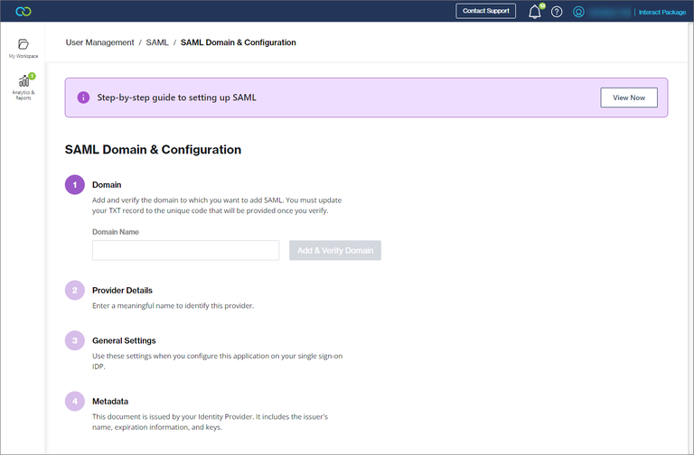 Add and verify the domain to which you want to add SAML, e.g., newtest123.com.