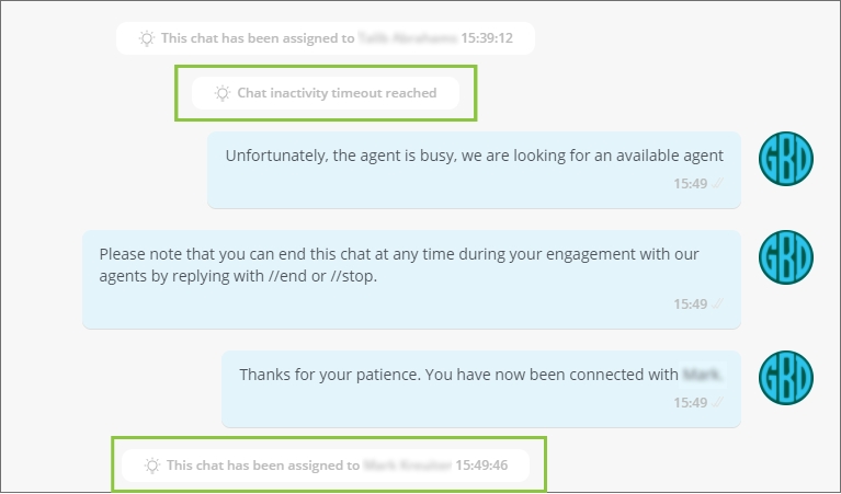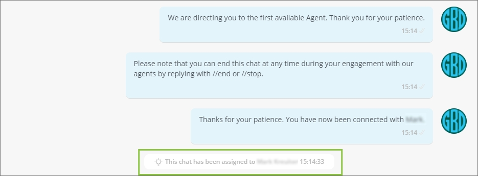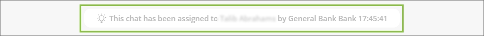 Visual indicator: This chat has been assigned to [[AgentName]] [[Timestamp]].