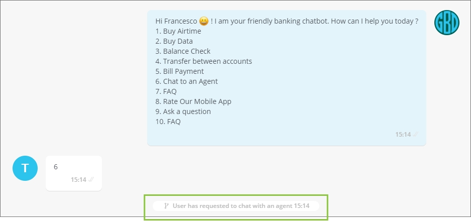 Visual indicator: User has requested to chat with an agent [[timestamp]].