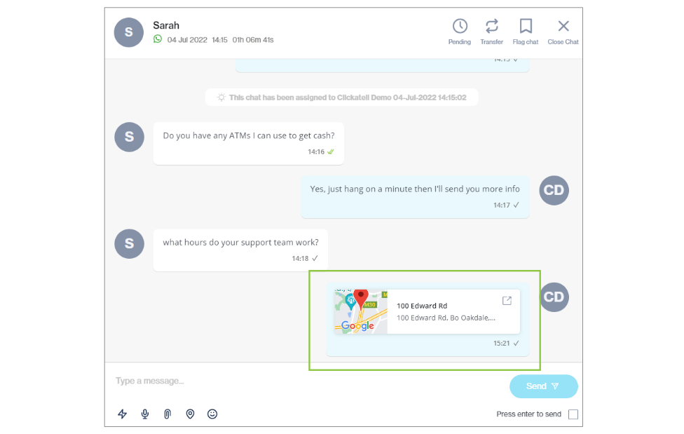 If you are using the SMS channel, the location will be shared as a link that the customer can click.