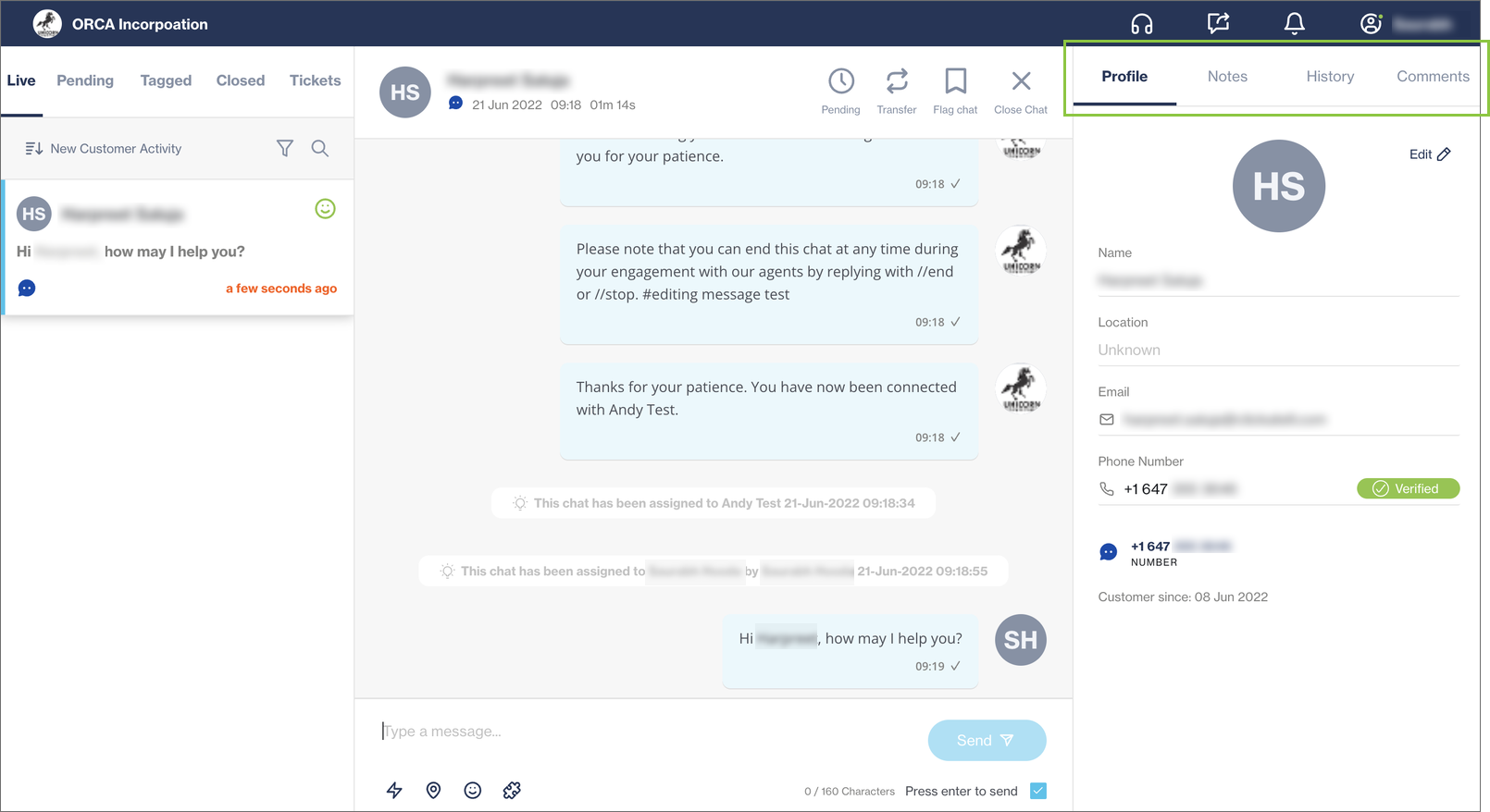 Customer profile, notes, and chat history are available across all agents, i.e., any agent who engages with this particular customer can access this information.