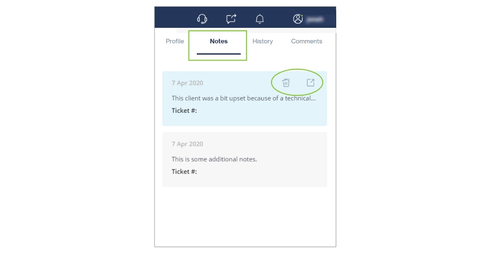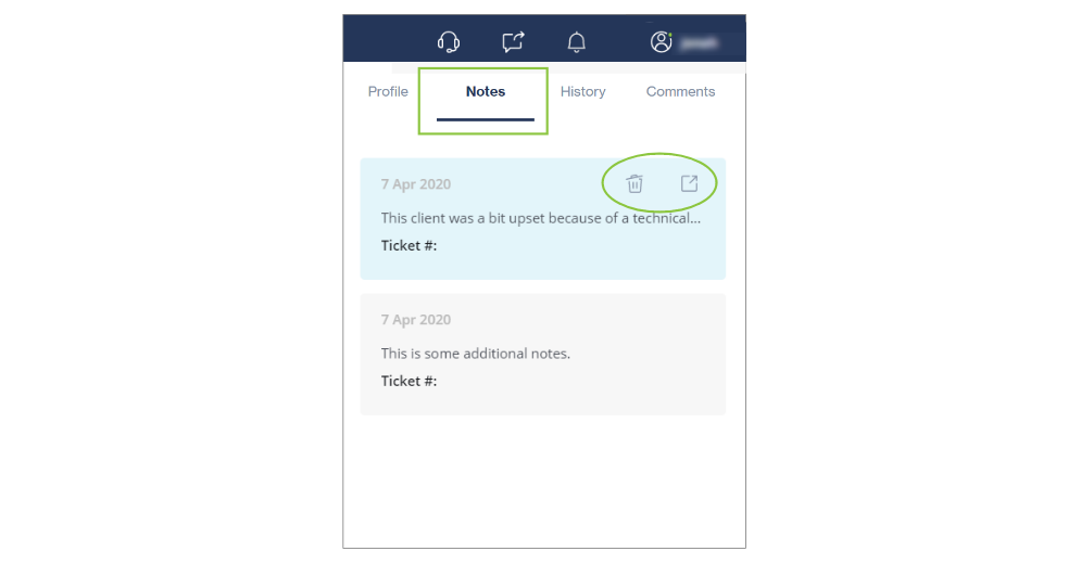 All notes are listed in the Notes tab, with the most recent at the top. You can view or delete the note by clicking on the relevant icon (visible when hovering over the note).