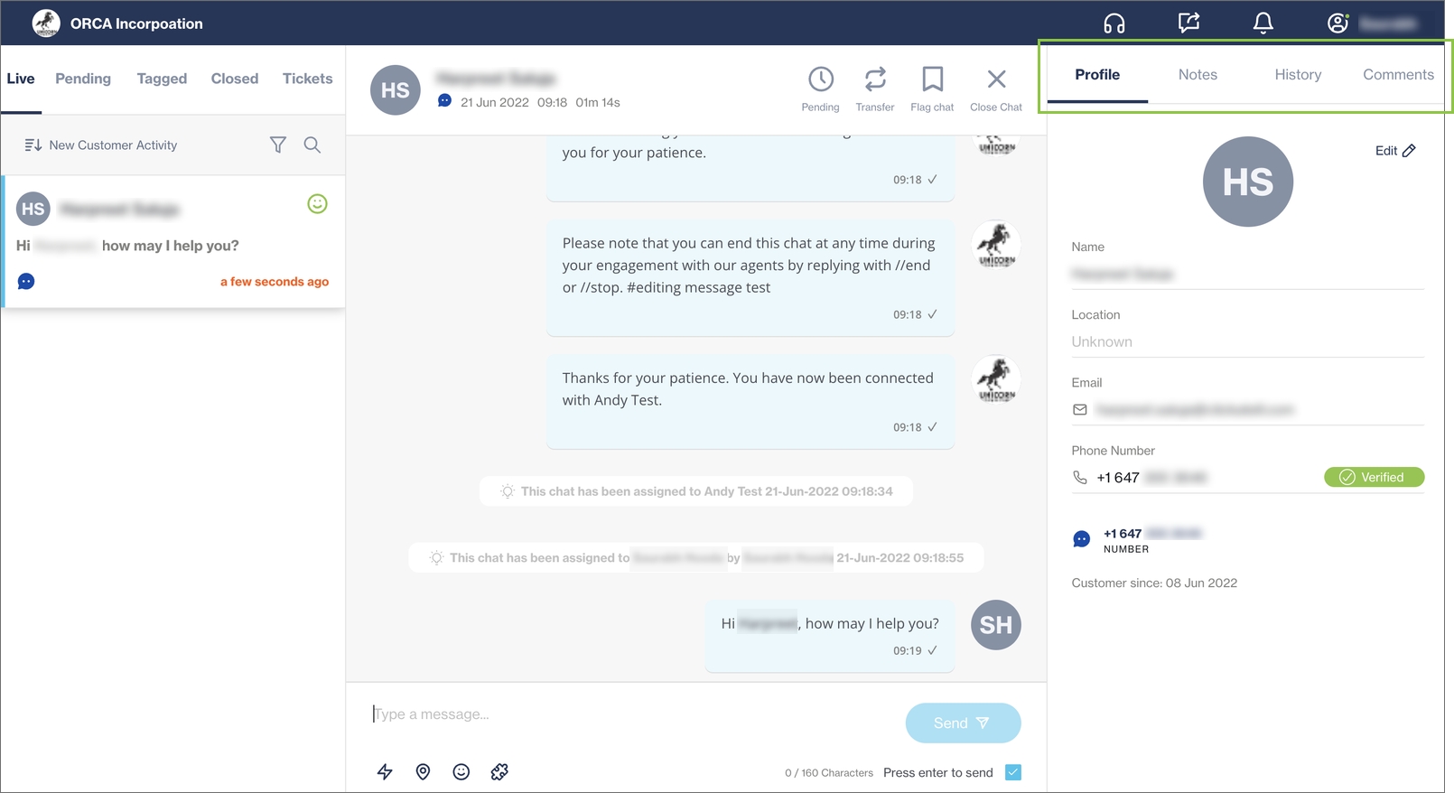 The Comments tab is only available for live chats and enables an agent or supervisor to tag any other agent/supervisor that is online for assistance. The agent/supervisor who was tagged can view the live chat in real-time and assist their colleague by adding comments to the chat. Comments only exist for the duration of a live chat.