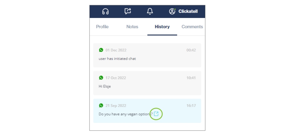 In the History tab, you can view all previous interactions with this customer. The most recent interaction is listed at the top.