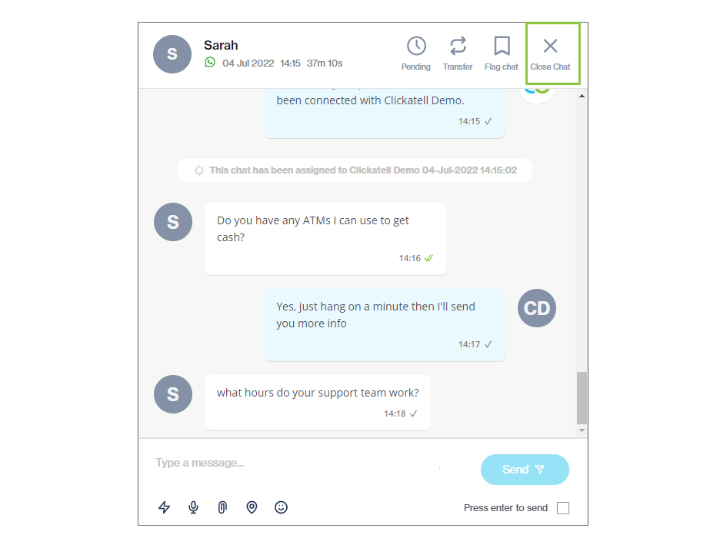 At the end of a chat, the agent can close the chat as follows:
