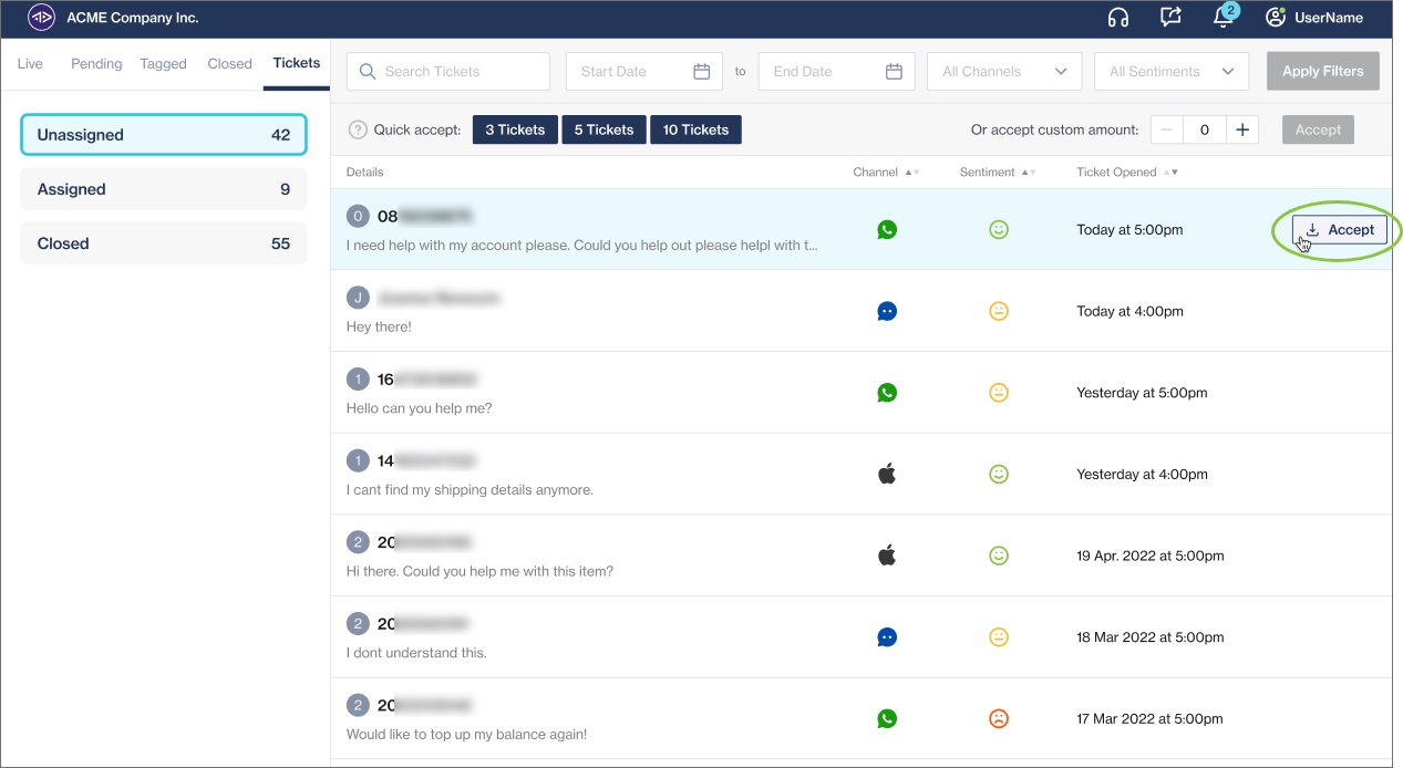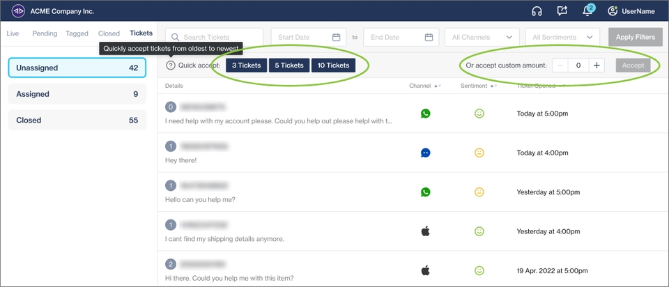 Agents can also use the Quick Accept buttons to quickly accept 3, 5, or 10 tickets. A custom number of tickets can also be specified. The availability of these buttons depends on the number of unassigned tickets available.
