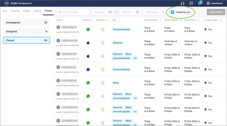 Agents can view all closed tickets and select a ticket to preview. Agents can select the Closed by me filter to view only those tickets that they closed themselves.