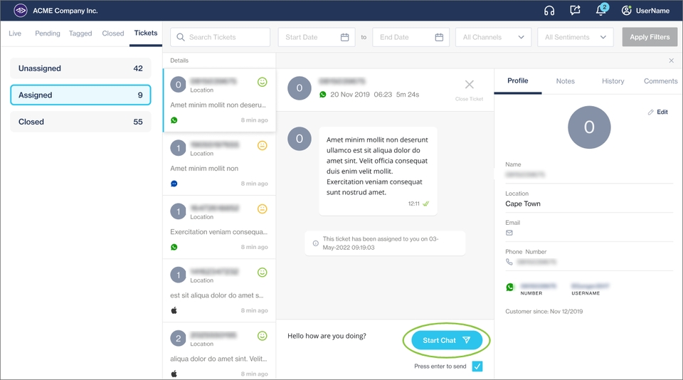 Agents can only view the tickets assigned to them, and there is no limit to the number of tickets that can be assigned to an agent. They can respond by selecting the ticket, typing the message, and clicking Start Chat.