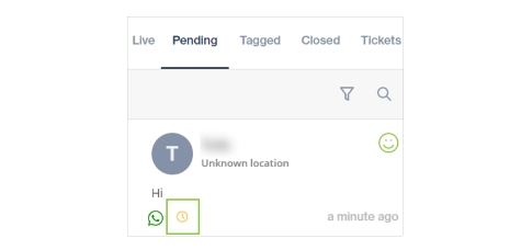 When engaging in a live chat, agents can select the Pending icon at the top of their chat window to mark the chat as "pending". The chat is moved from the Live tab to the Pending tab.
