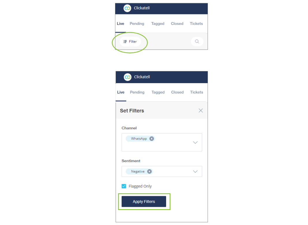 As an agent, you can quickly and easily find a specific chat that you want to respond to or reference by using the search and/or filter functionalities. This can be applied to live chats, closed chats, or tickets.