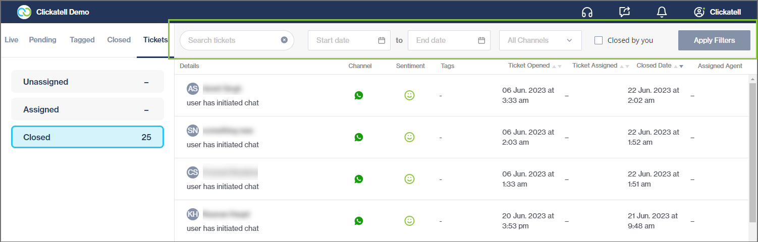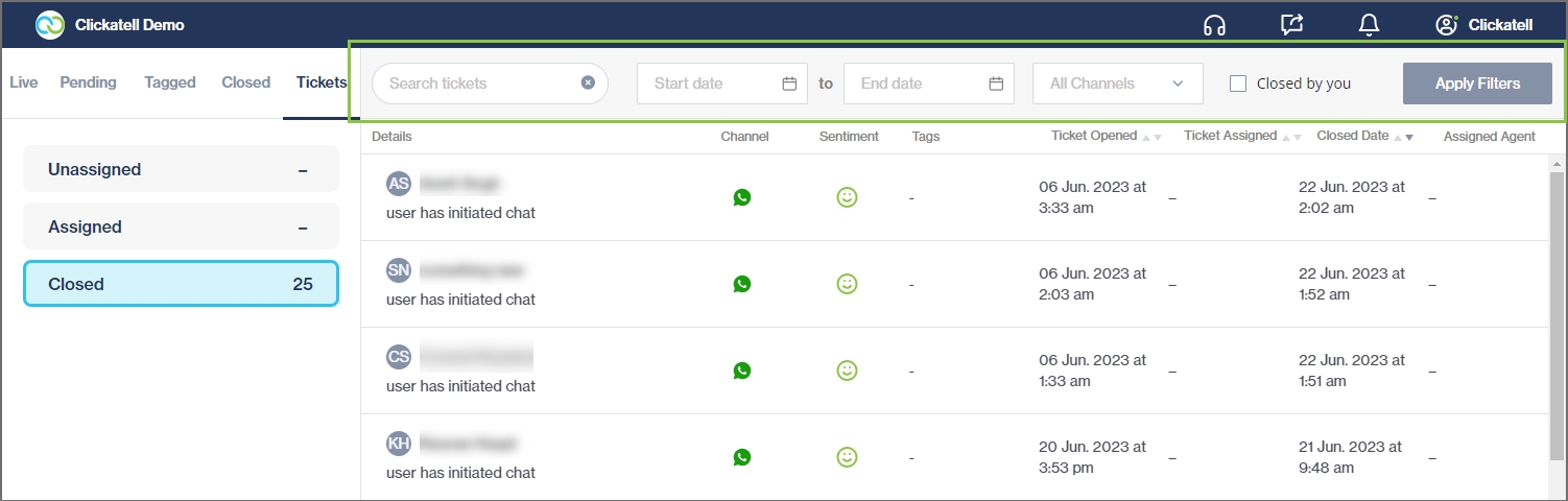 Date range (for Closed chats and Tickets) - Filter to see only chats/tickets that fall within a certain date range.