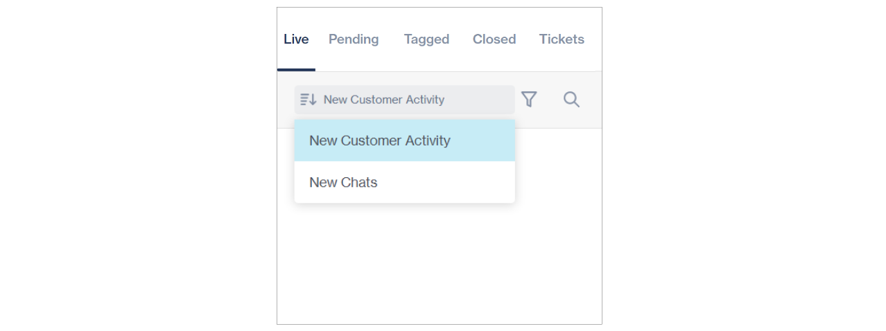 New Customer Activity: Sorts live chats based on new activity from a customer. I.e., any new message/activity from a customer moves the chat to the top of the list (note: new activities by an agent are not considered for sorting).