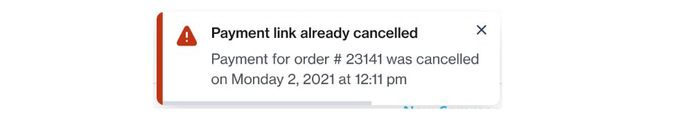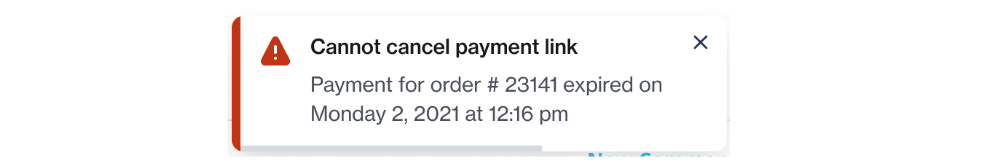 If the payment link expired, it cannot be canceled. This happens if the customer hasn't clicked the payment link within 5 minutes. The following status message is shown: