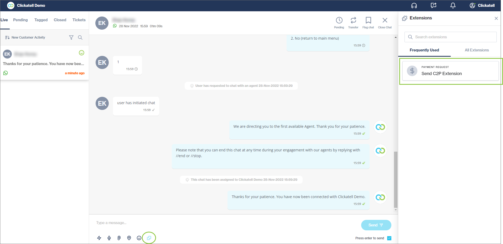 As an agent, you can use the Chat 2 Pay extension to send a payment request to a customer directly from Chat Desk.