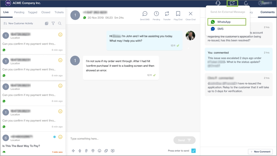 You can also access this modal from within a specific chat. In this case, the customer's contact number auto-populates.