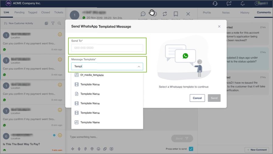 In the Send WhatsApp Templated Message modal, enter the customer's contact number in the Send To field.