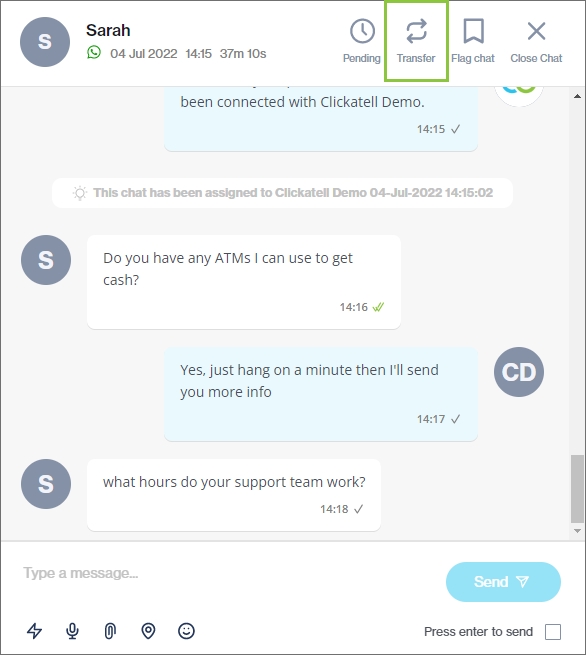 - Select a live chat and click the Transfer button at the top right-hand corner of the chat.