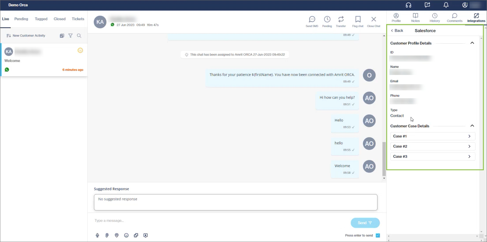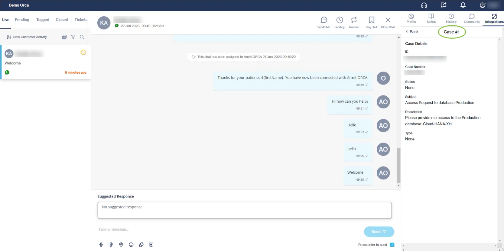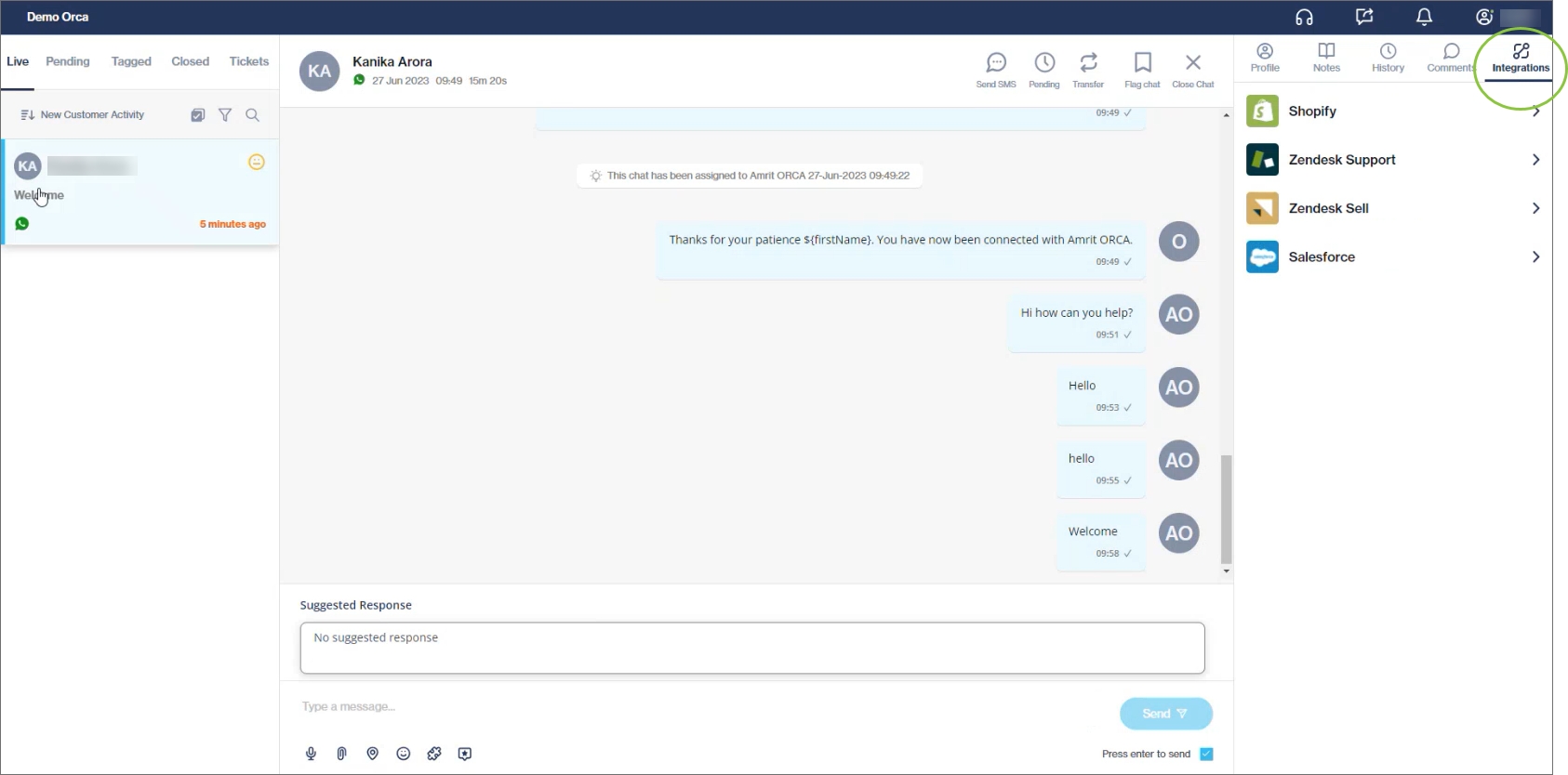 - If the customer you are engaging with is also present in any of the active 3rd party providers set up in your Clickatell account, an Integrations tab appears in the panel on the right.