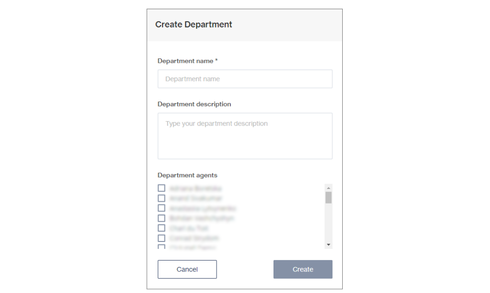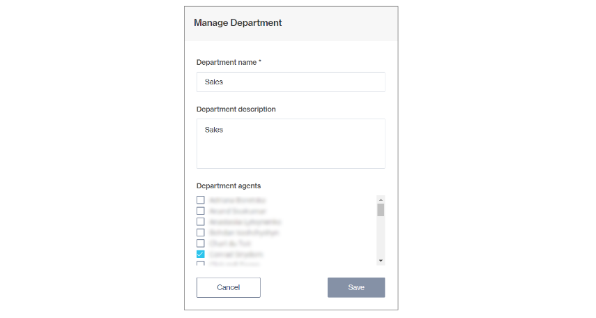 Manage department opens a pop-up where you can edit the department's name and description, and add/remove agents to/from the department.