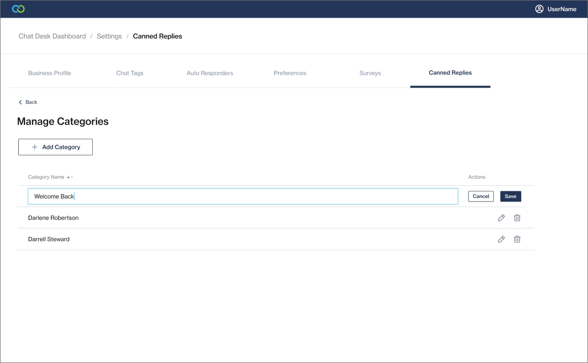 If you update a category name, the update will pull through to all canned replies assigned to this category.