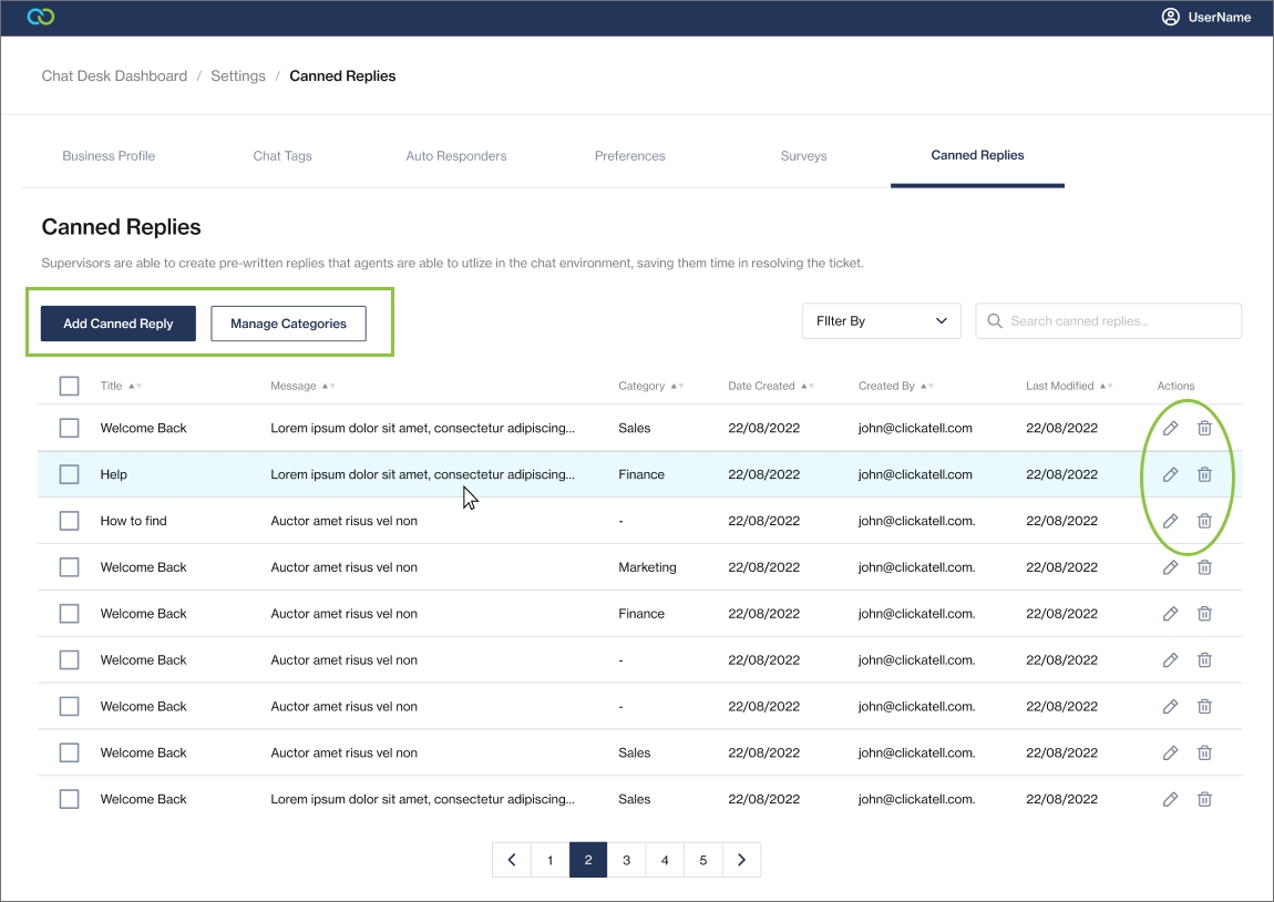 Edit/delete canned replies.