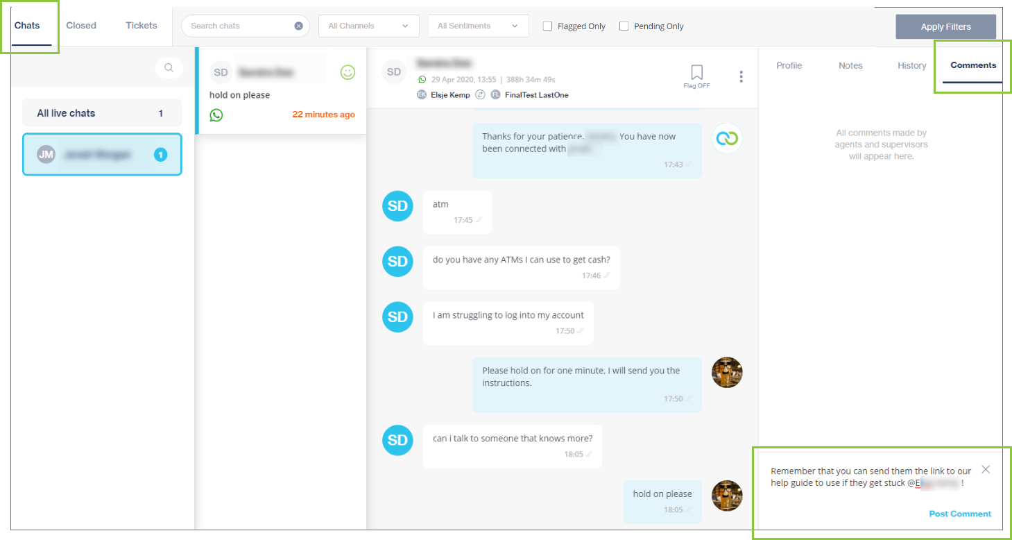 Supervisors cannot participate directly in the live chat, but they can add comments.