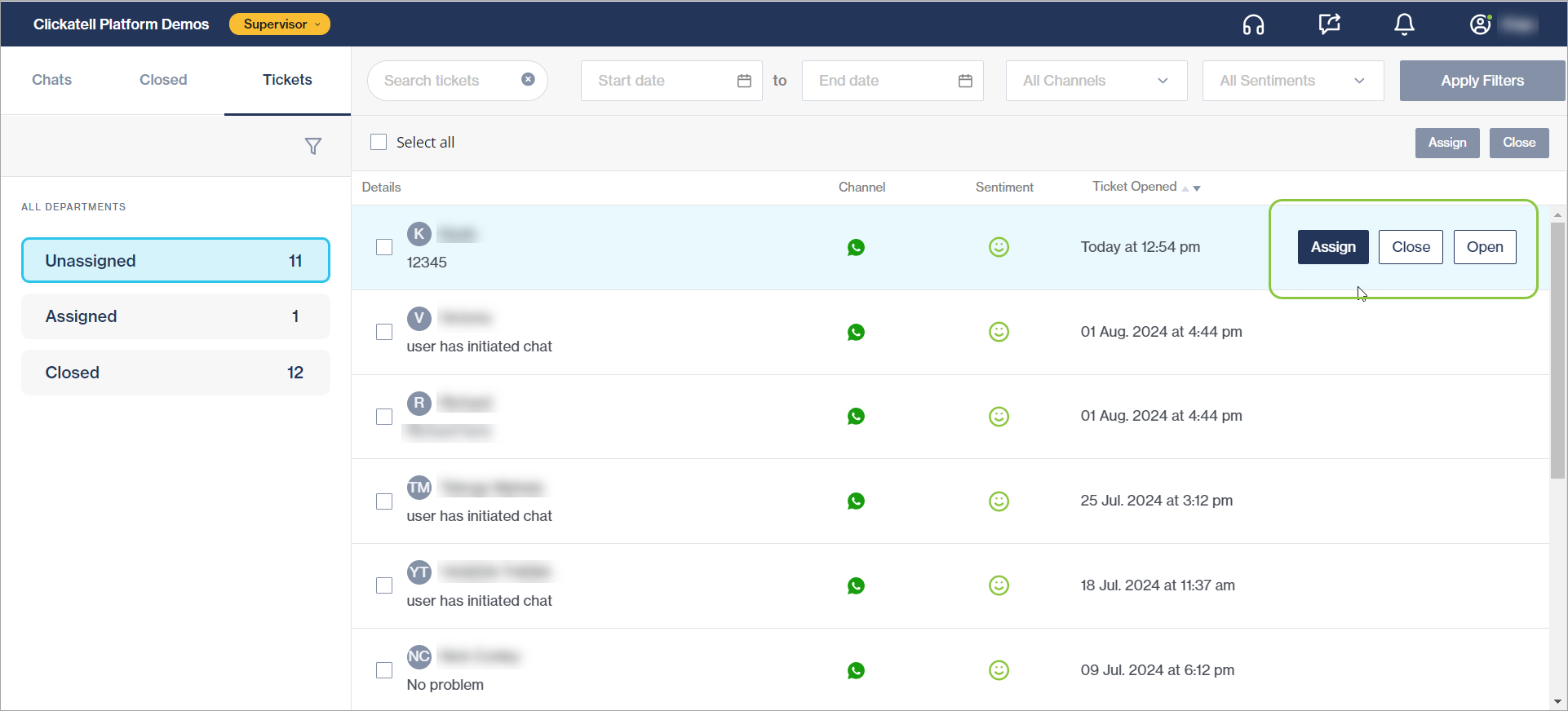 Unassigned: Lists all tickets that have not been assigned to any agent yet.