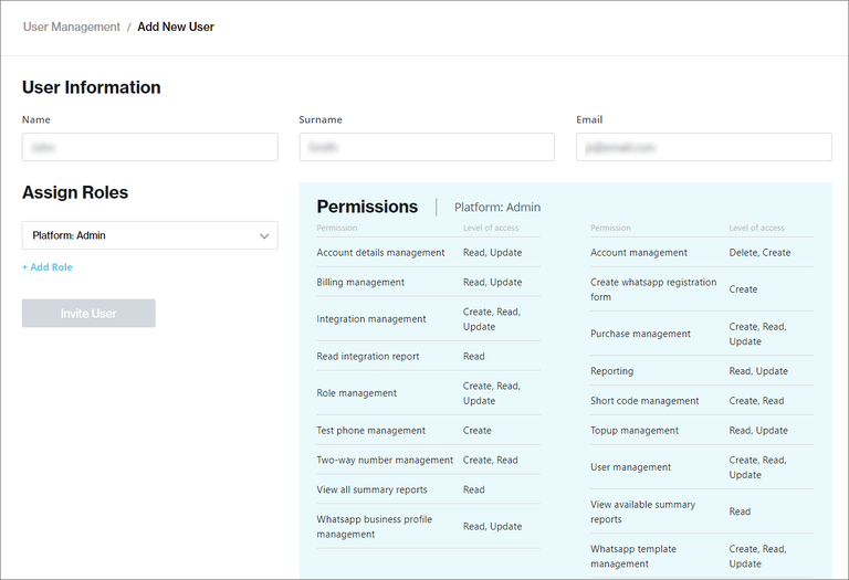 Select a role from the drop-down for more information about the permissions associated with the role (view in the blue block).