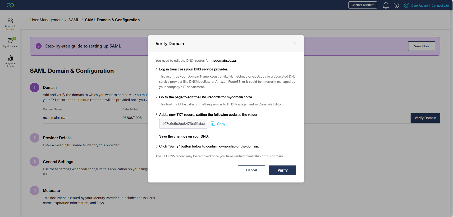 Add and verify the domain to which you want to add SAML, e.g., newtest123.com.