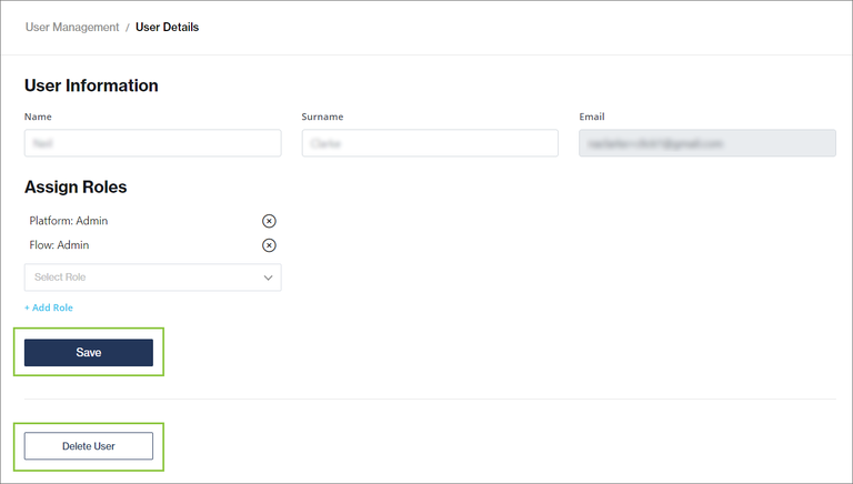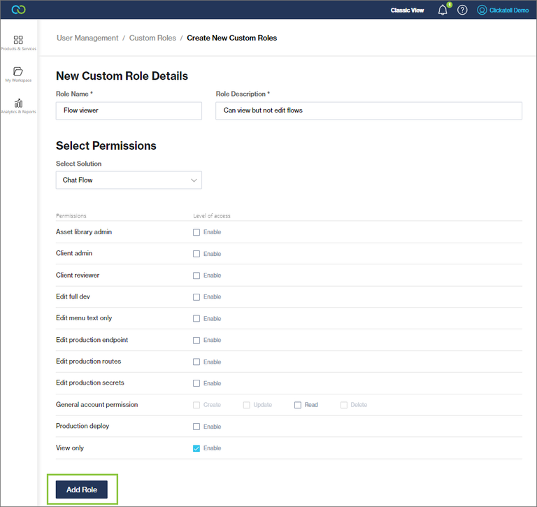 The new custom role is added to the Custom Roles table and is available to assign to users when adding new or updating existing users.