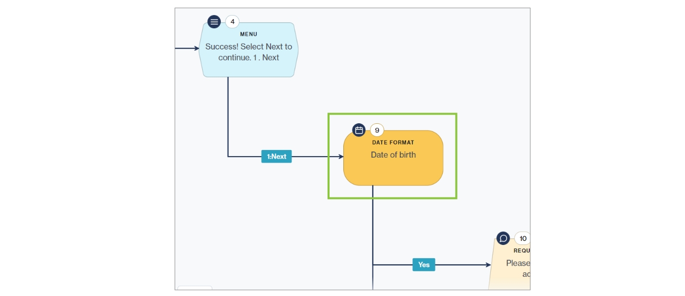 For example, if a user enters a date in yyyy-MM-dd format and we want to convert it into dd-MM-yyyy format, you can use the Date Format node. After a successful conversion, the node will return a "Yes" response. If the conversion failed, the node will return a "No" response.