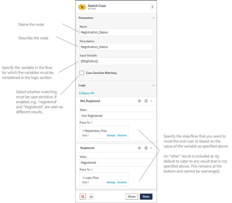 Add a variable in your flow, e.g., Registration_Status, that captures where the customer is in their registration flow. Add a Switch Case node and refer to this variable in the Variable field.