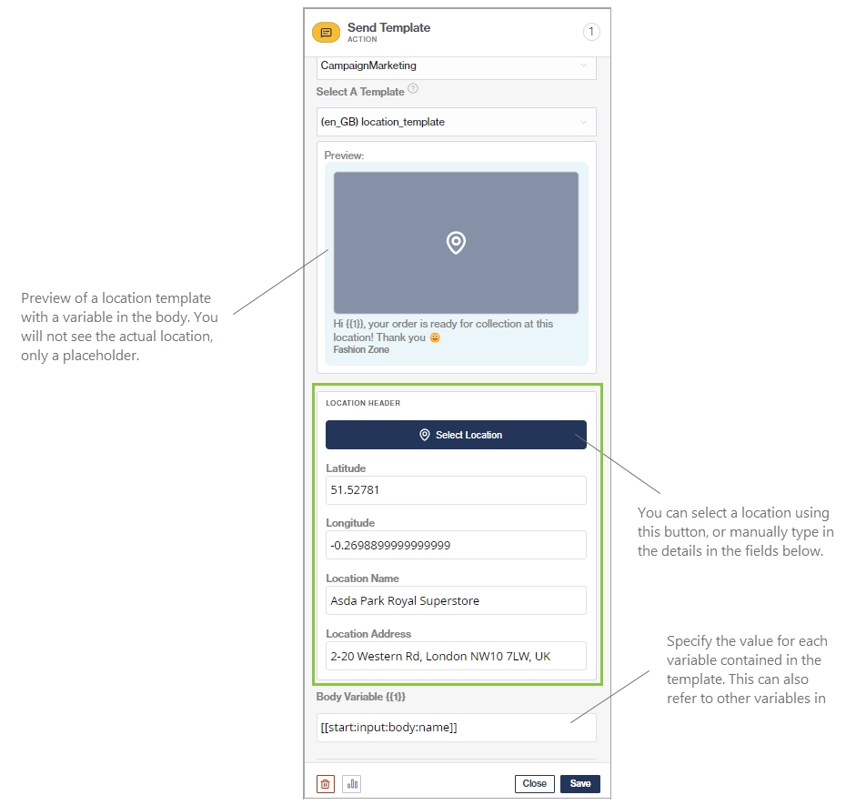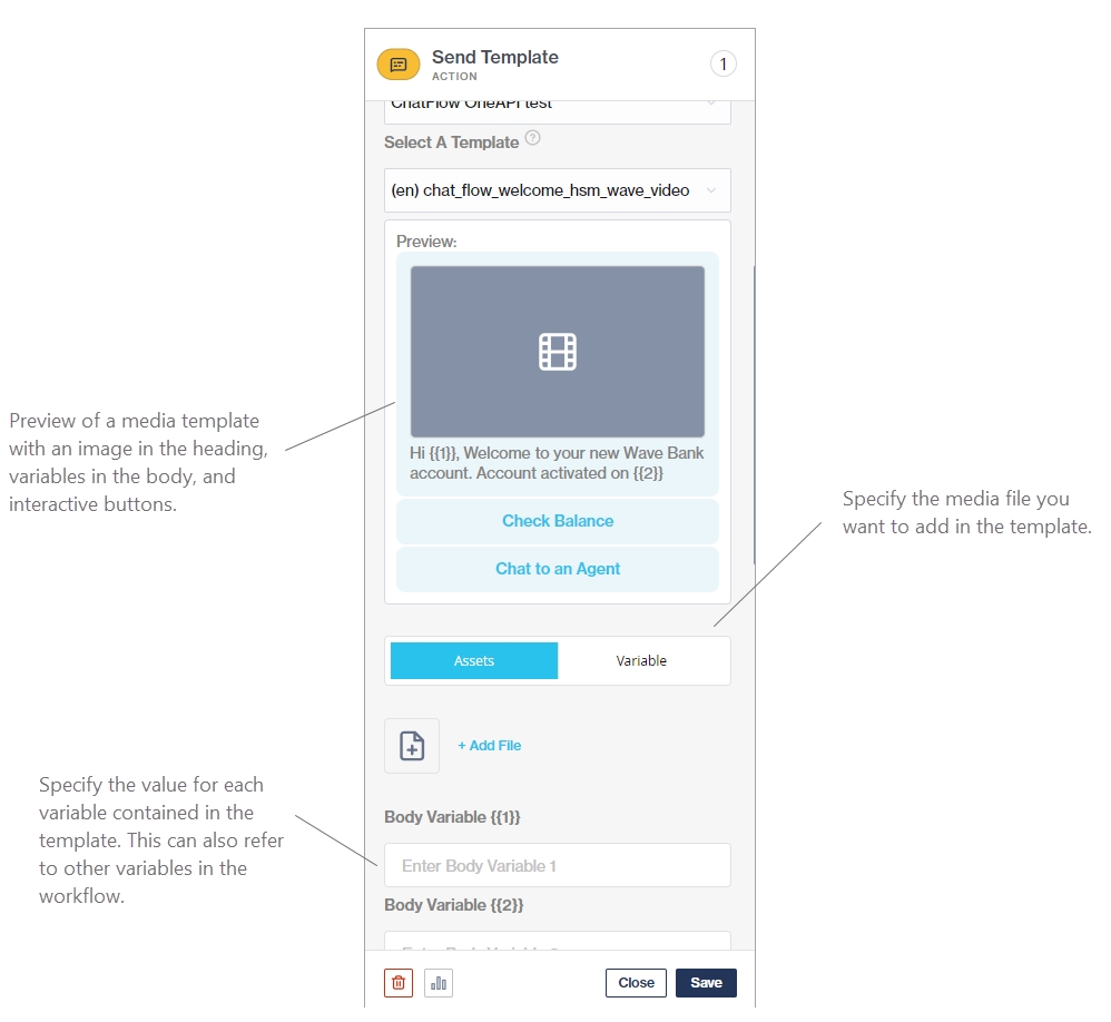 The Send Template action node enables you to send pre-approved WhatsApp message templates to your customers from within Chat Flow.