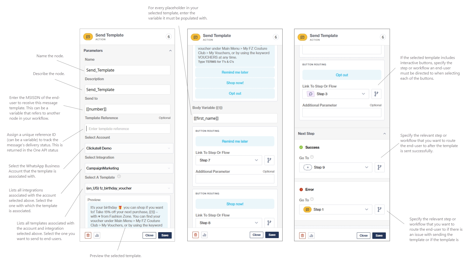 Below is an example of configuring the node if a template with interactive buttons is selected.