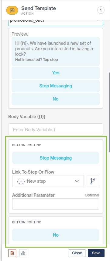 The flow-builder can configure the next flow/step to execute when the customer selects each button. Additional data that needs to be sent for postback data can be added if required.