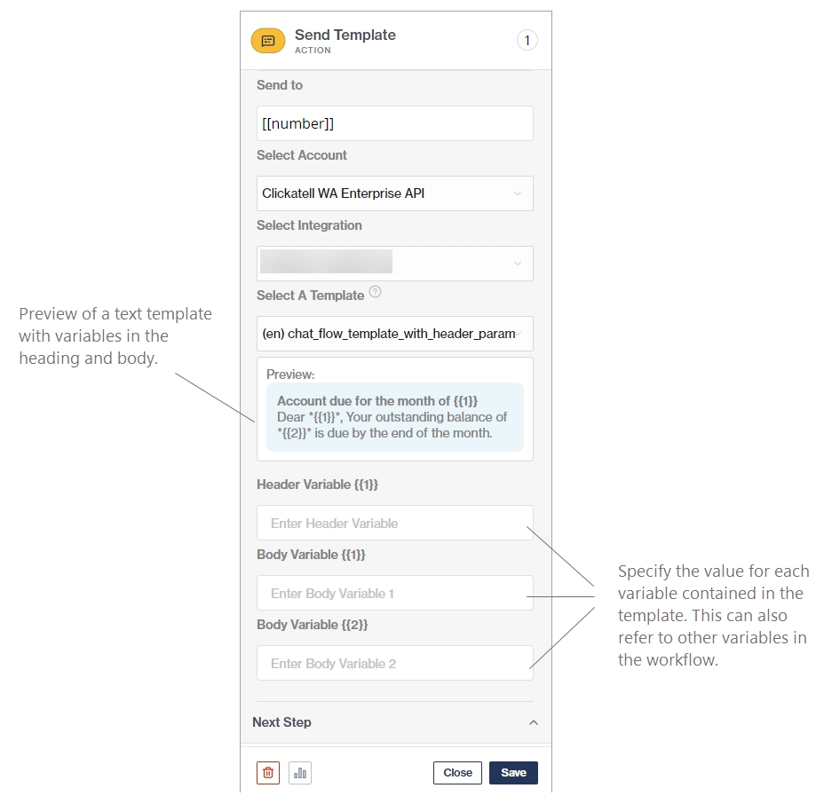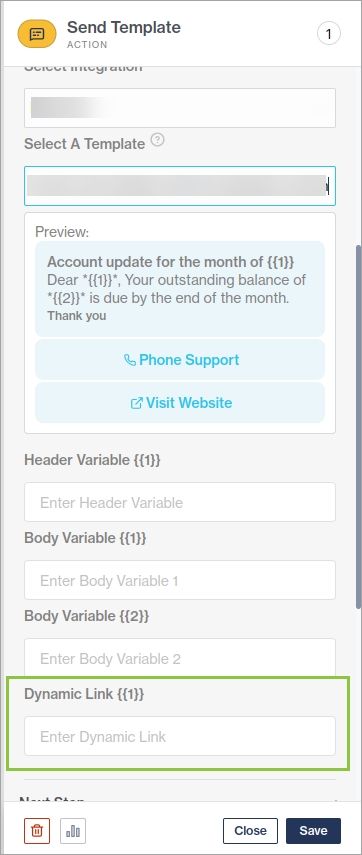 If the template contains a dynamic URL, the flow-builder must capture the variable's value in the field as shown below.