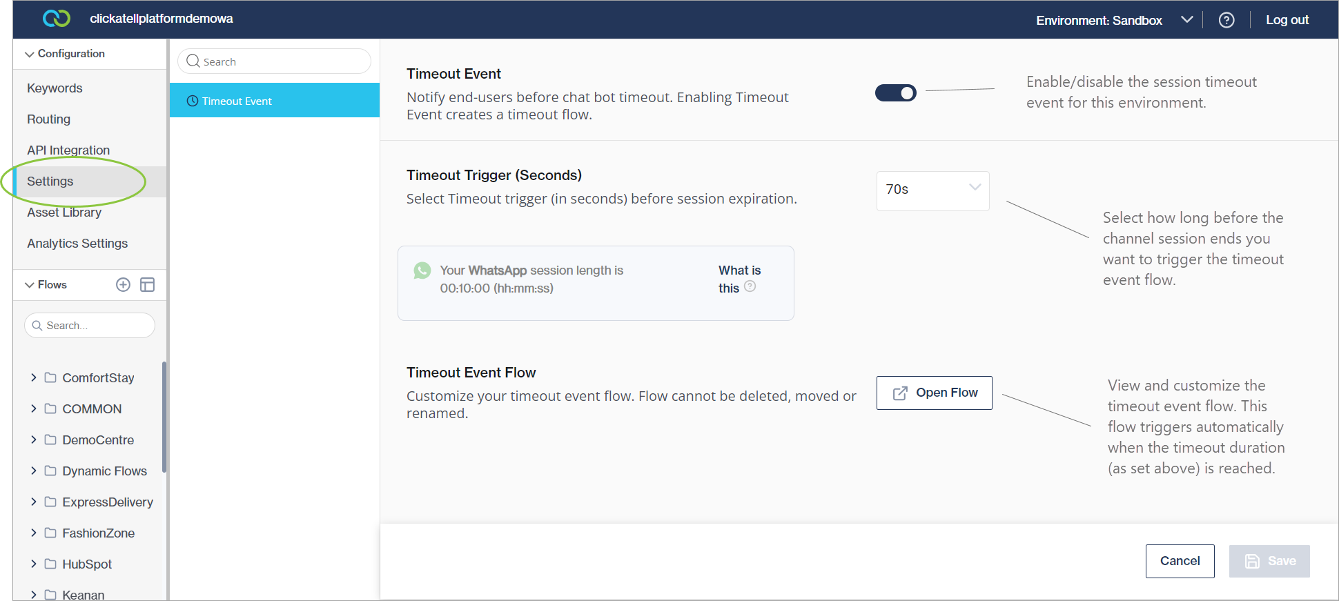 Session Timeout Event configuration functions independently in the Sandbox and Production environments. This allows the flow-builder to activate the feature in Sandbox for testing proposes while it's deactivated in Production, or vice versa.