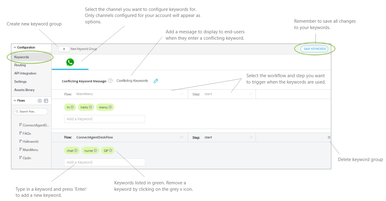 Note that global keywords take preference over menu logic keywords. If the same keyword is used both on a global level and for a specific node in one of your flows, the action as specified for the global keyword is triggered whenever the keyword is used in any flow.
