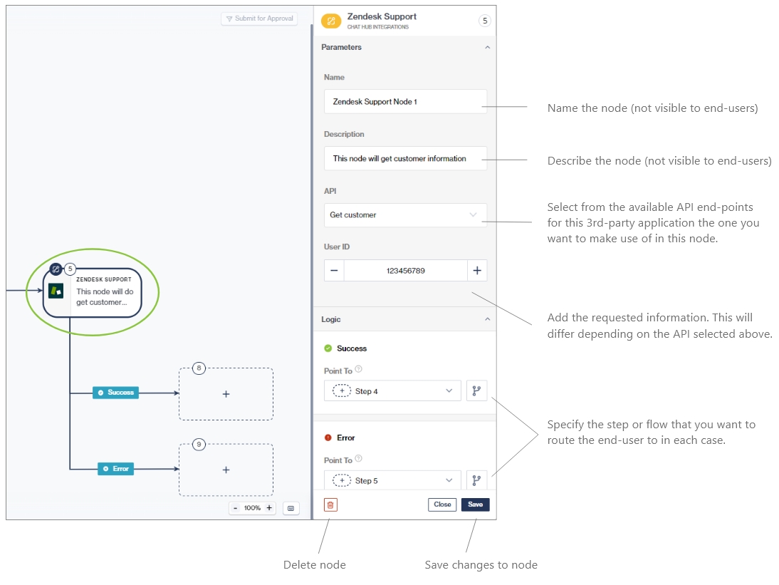 Under Integrations Nodes in the panel on the right, all the applications already set up in the Clickatell Portal are displayed.