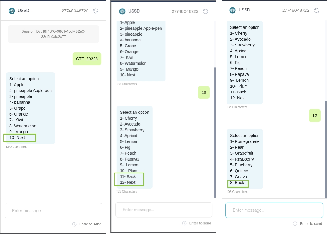 If the list is more than 10 items, the first nine items of the list will be shown as per usual, and the 10th option will be a Next button. When the user clicks the button, the following nine items appear. The flow-builder can customize the text of the option the customer selects to go to the next or the previous set of options.