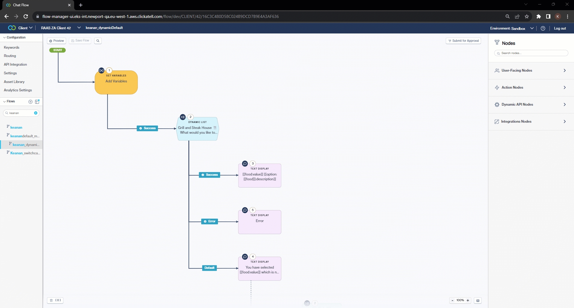 If the customer enters an invalid option (i.e., an option that is not on the list), you can configure a "default" node or flow to follow automatically. The default flow is optional, and if not set up, the node will simply repeat itself if an invalid option is entered.