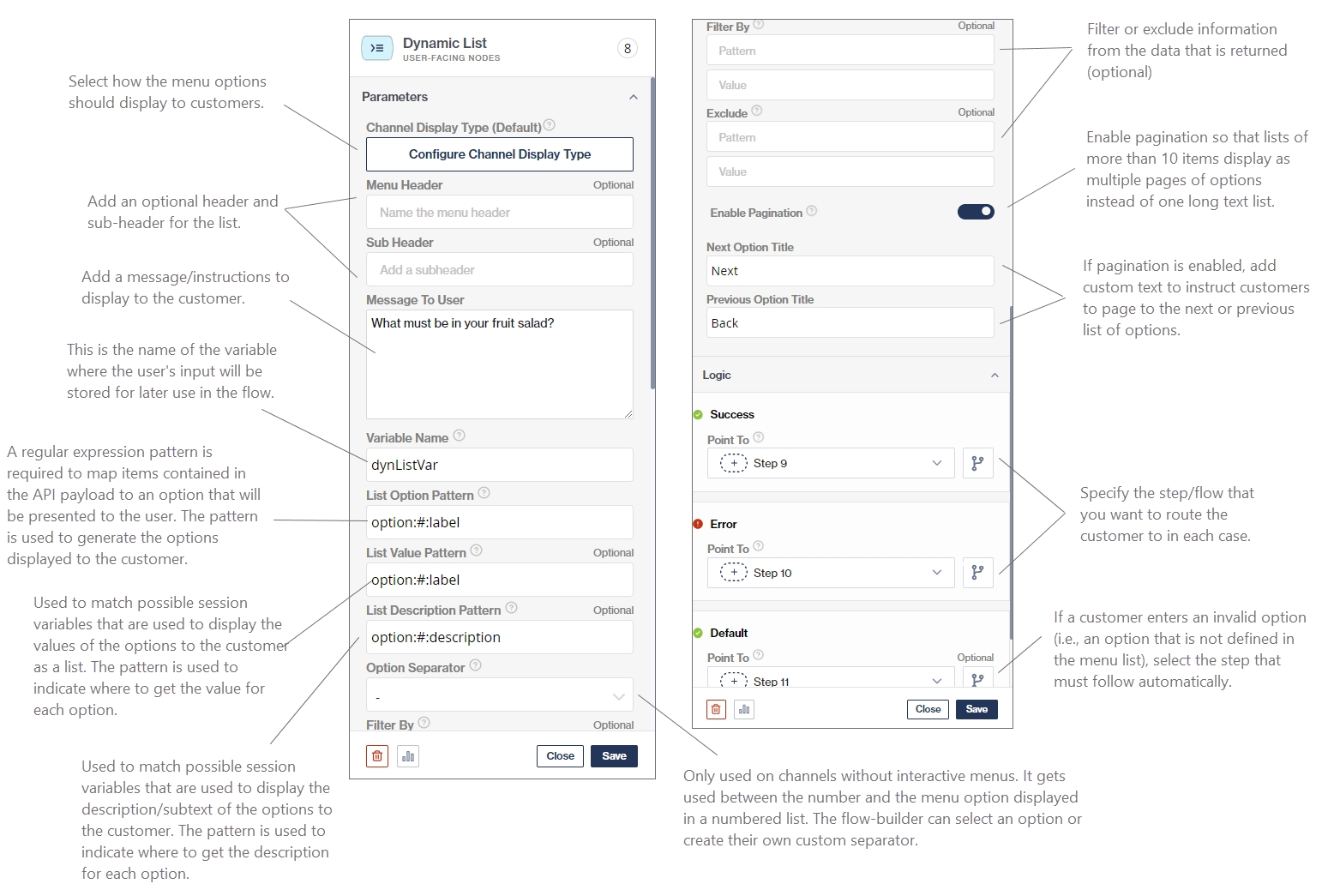 The Dynamic List node allows the flow-builder to display a personalized list of options to a customer that they can select from.